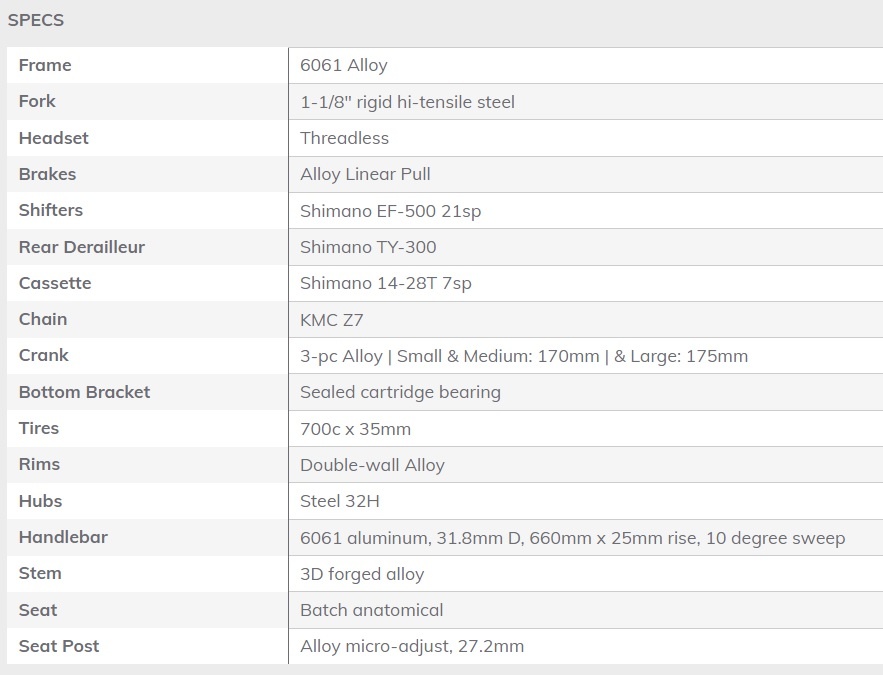 It's time to get out and ride. Whether you're riding with friends or looking to add a little more exercise to your daily routine, the fitness bike can take you anywhere. With smooth, fast-rolling 700c tires and Shimano Tourney 21-speed shifting system, this bike is perfect for any ride. The range of gears makes the Fitness Bike a capable bike for getting up and down hilly terrain, through urban and rural settings alike. The flat handlebar offers an efficient, comfortable riding position for getting your heart pumping while getting out in the fresh air.