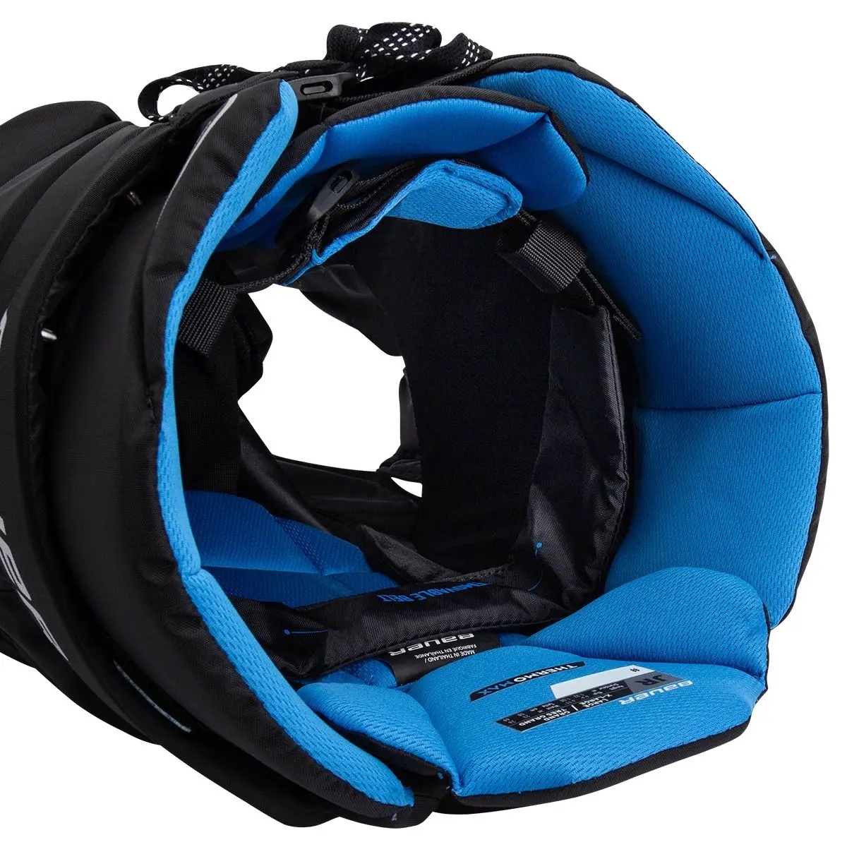 For the legs,, Bauer has a molded 3-layer foam which offers better protection and an integrated loop for the knee guards allows for easy attachment.