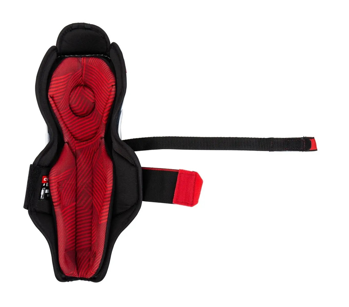 Molded plastic from top to bottom help to disperse impact energy away from the leg from falls to the ice or contact with a stick or puck. Both the knee and shin caps offer added breathability with ventilation ports, which help to keep the legs cooler during the game. A large calf strap has an even larger Velcro landing pad to give players a truly dialed-in fit around the leg. Internally, a sublimated PE foam liner once again elevates comfort and is removable so players can reduce drying times and give it a wash between games.