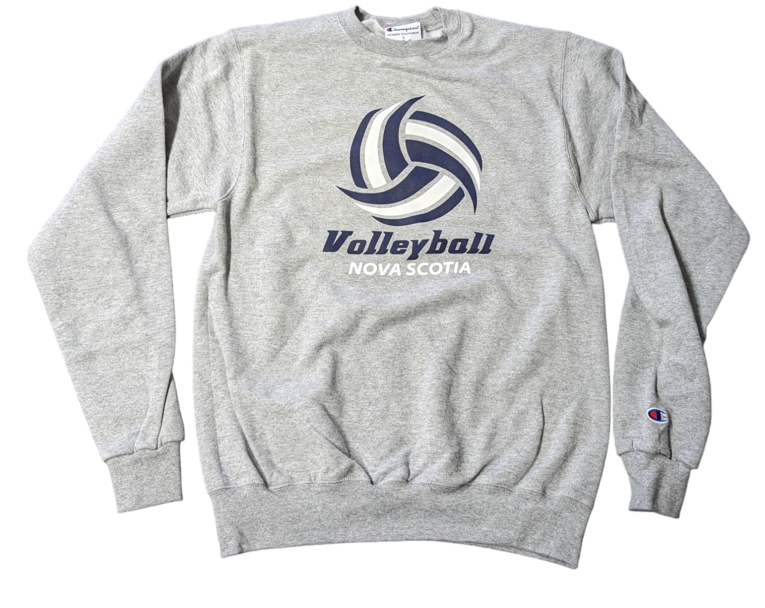 Volleyball Nova Scotia Logo Screen printed of front. Champion logo on sleeve.