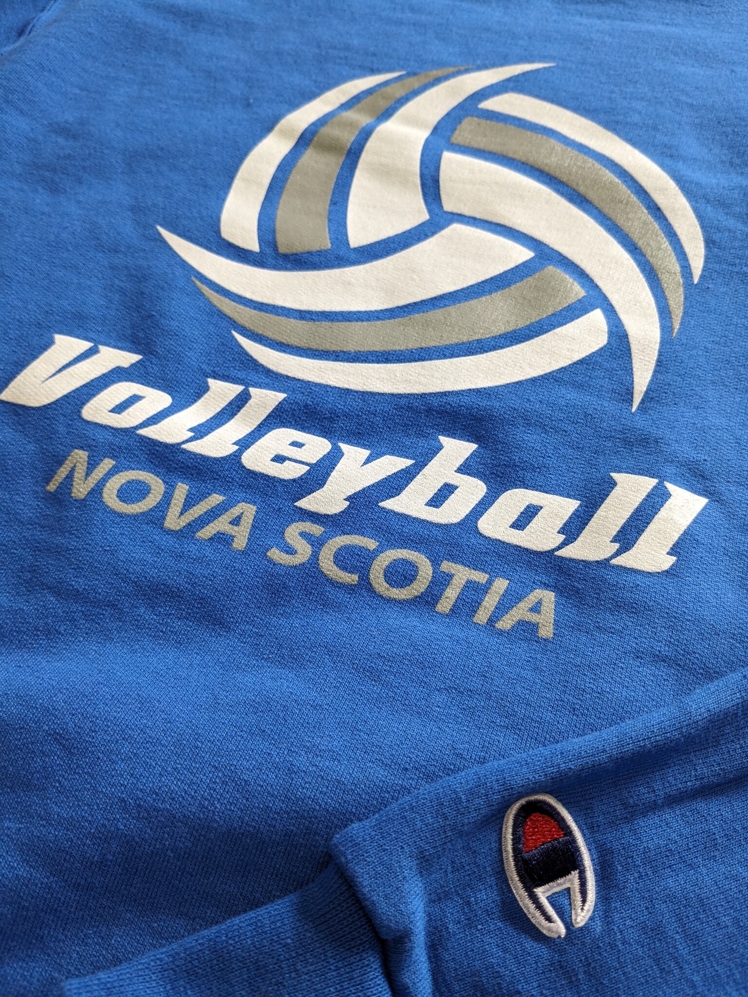 Volleyball Nova Scotia Logo Screen printed of front.  Champion logo on sleeve.