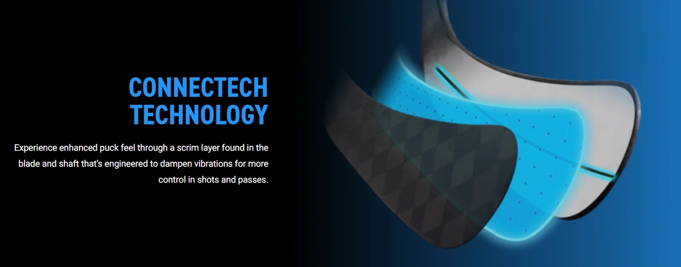 - CONNECTECH Technology – Experience enhanced puck feel through a scrim layer found in the blade and shaft that’s engineered to dampen vibrations for more control in shots and passes.