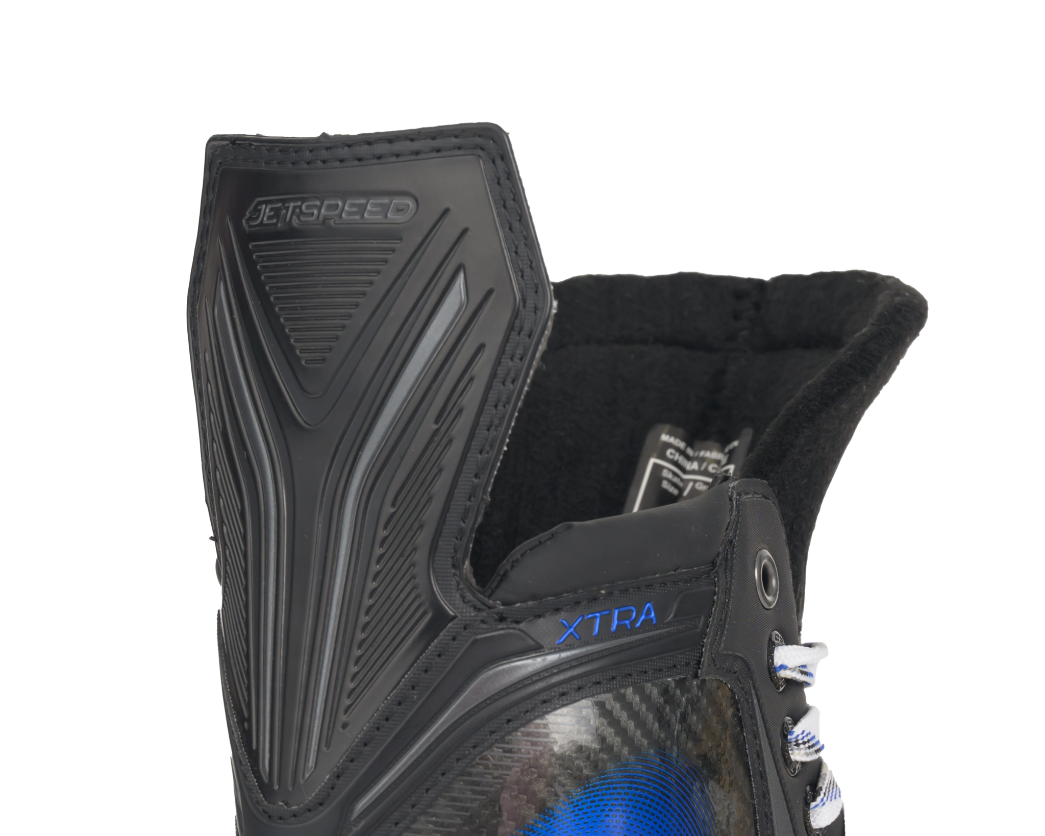 CODE BLUE: The JETSPEED XTRA skates offer performance, comfort, and durability. The 2D quarter with faux carbon skin provides an ergonomic fit with added stiffness and support while staying lightweight. The HD microfiber liner with EVA layer enhances comfort, while ADPT memory foam ankle pads ensure a snug fit. A 7mm felt tongue with 3D mesh lacebite protection adds support, and the CCM Ortholite footbed provides lightweight cushioning.