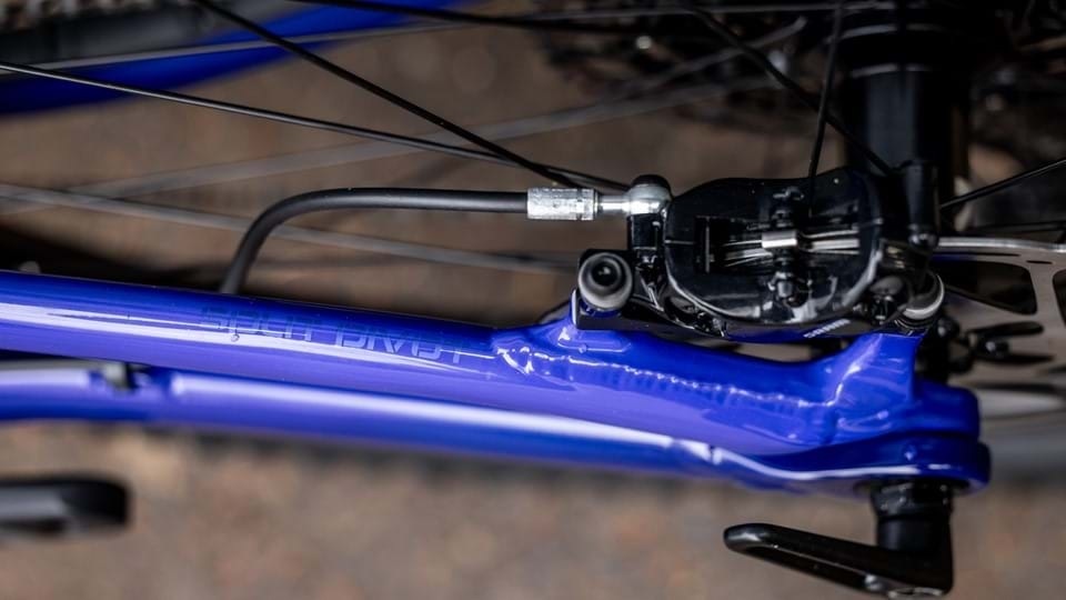 Rear pivot brake cable clip complements streamlined architecture and shuns frame rubbing.