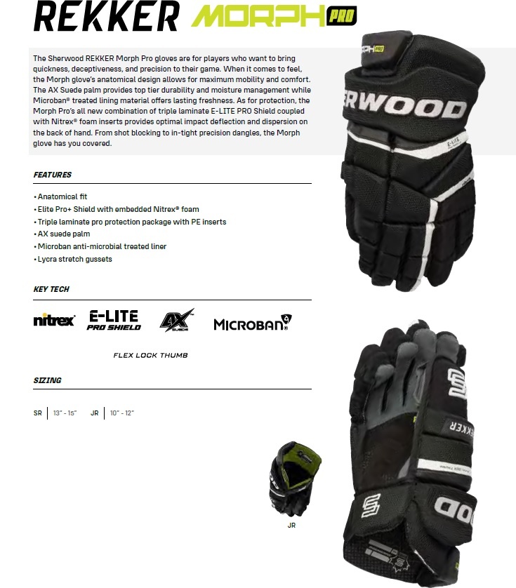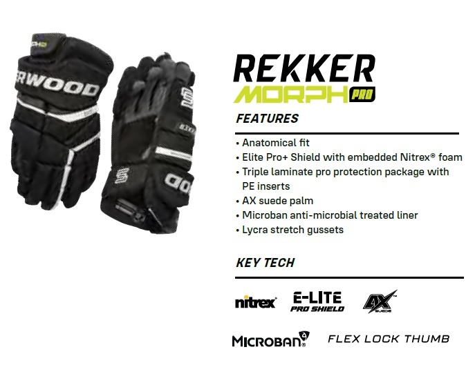 The Sherwood REKKER Morph Pro gloves are for players who want to bring quickness, deceptiveness, and precision to their game. When it comes to feel, the Morph glove’s anatomical design allows for maximum mobility and comfort.