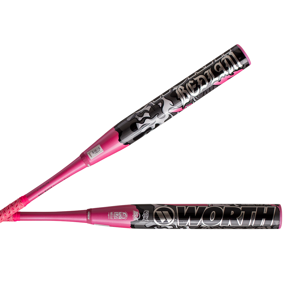 The Worth Bedlam Phill Matte Signature Edition 13.5" slo-pitch bat features a unique design in hot pink.