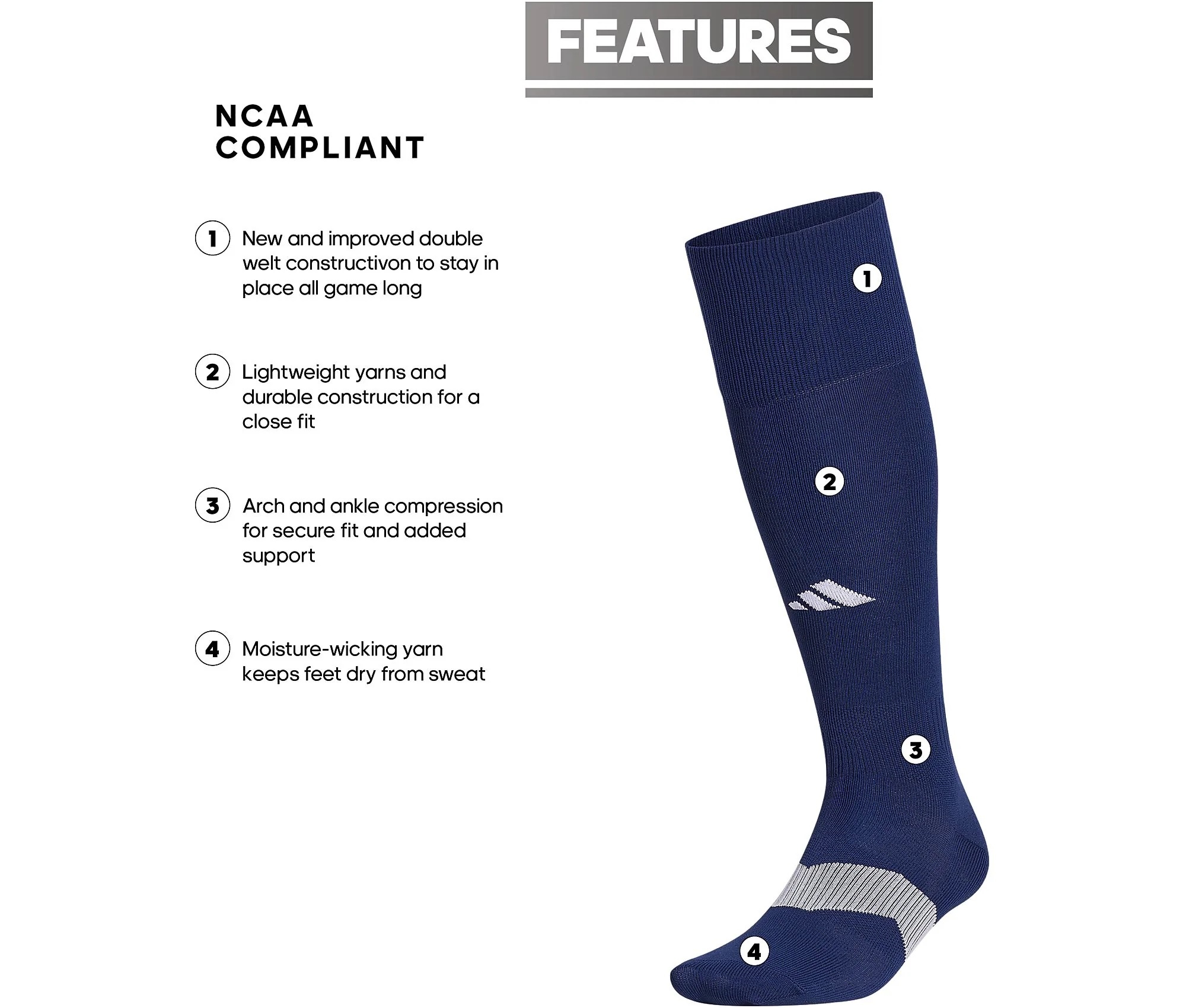 Product descriptionThese adidas socks are designed with double-welt construction to keep them in place all game long.The over-the-calf socks are made of moisture-wicking yarn and are NCAA compliant.Arch and ankle compression adds to the secure and supportive fit.