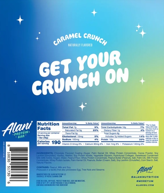 Stuck on smarter snacking? Us too! Our chewy Caramel Crunch Alani Protein Bars are gluten free and packed with 16g of protein, 190 calories and 8g of sugar. Made with a gooey, melt-in-your-mouth caramel center, we top each treat with salty peanuts and sweet chocolate.