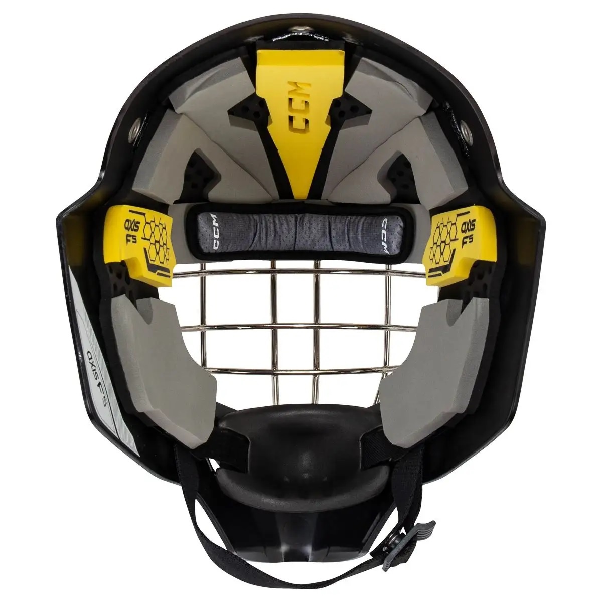 Multi-Layered VN Foam Lining: Lining the Axis F5 mask, multiple layers of VN foams balance comfort and impact resistance, without giving it a bulky feel. Vinyl Nitrile foams are frequently found in player helmets and goalie masks, chosen for the foam's closed-cell formation that helps to repel excess moisture with a soft, form-fitting feel