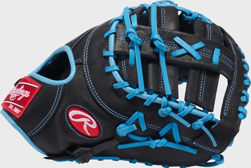 The full leather construction comes game-ready with a soft feel and excellent durability. Designed in a sleek Black and Columbia Blue colorway, this mitt brings standout style to dependable first base performance.