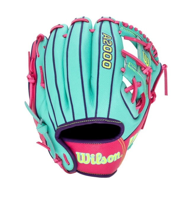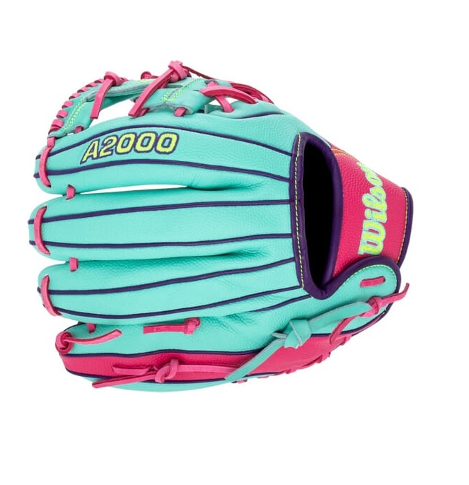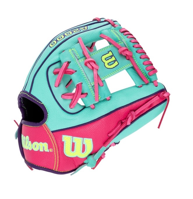 Constructed with Pro Stock leather, the glove is built to last and offers the unmatched feel trusted by elite athletes. The Comfort Pro™ Fit features a soft ProLux leather liner and a Comfort Sleeve at the wrist for a smooth, broken-in sensation. Rolled Dual Welting keeps the glove’s structure in top form, while Flat Finger Binding offers extra comfort for players who keep a finger outside the glove. Finished in a bold Seafoam, Purple, and Pink colorway with clean Wilson branding, this glove is a serious performer with serious style.