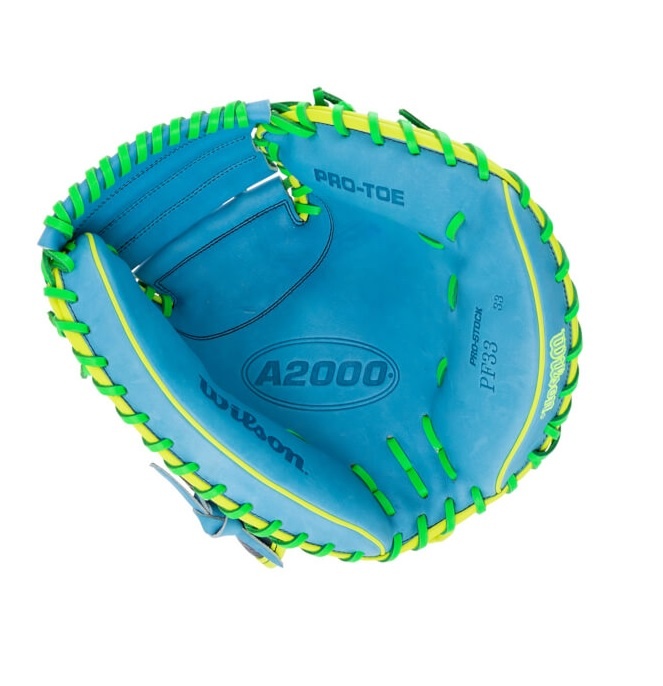 Constructed from Wilson’s rugged Pro Stock leather, the PF33 is built to last through seasons of high-volume use while forming to your hand over time. The Double Palm Construction adds extra stability in the pocket and reduces wrinkling in the palm, while Rolled Dual Welting helps the glove maintain its shape through every inning. Inside, you’ll find Wilson’s Comfort Pro Fit system, which includes a Pro Lux hand lining for a soft, personalized feel and a Comfort Sleeve around the wrist binding for irritation-free wear. The Dri-Lex wrist lining wicks away sweat, and Flat Finger Binding adds extra comfort for catchers who wear their index finger on the outside.