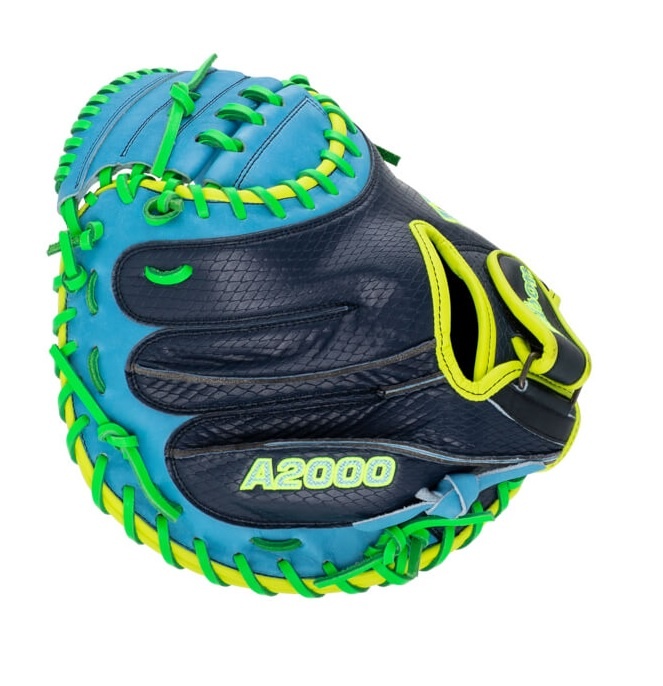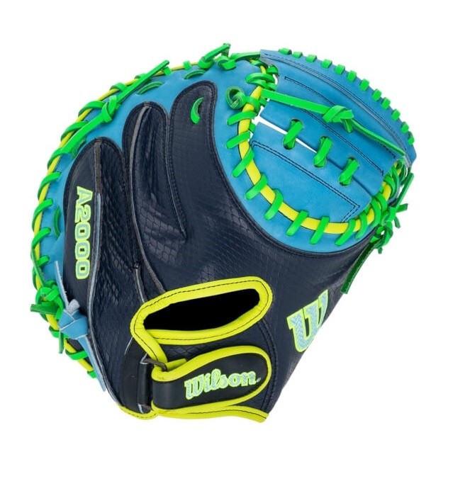 PF33 Pattern; 33″ catcher's mitt with a two-piece closed “half-moon” web, deep pocket, plus shortened finger stalls and narrow wrist opening—Pedroia Fit designed to provide catchers with smaller hands (youth through petite adults) a secure, comfortable hold and easy on-field adjustments via Velcro strap.