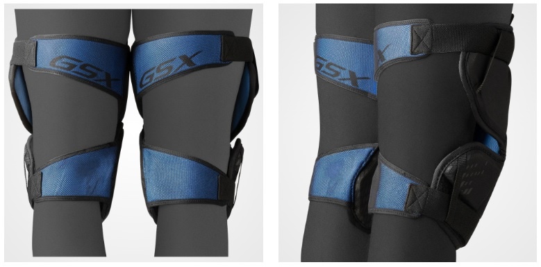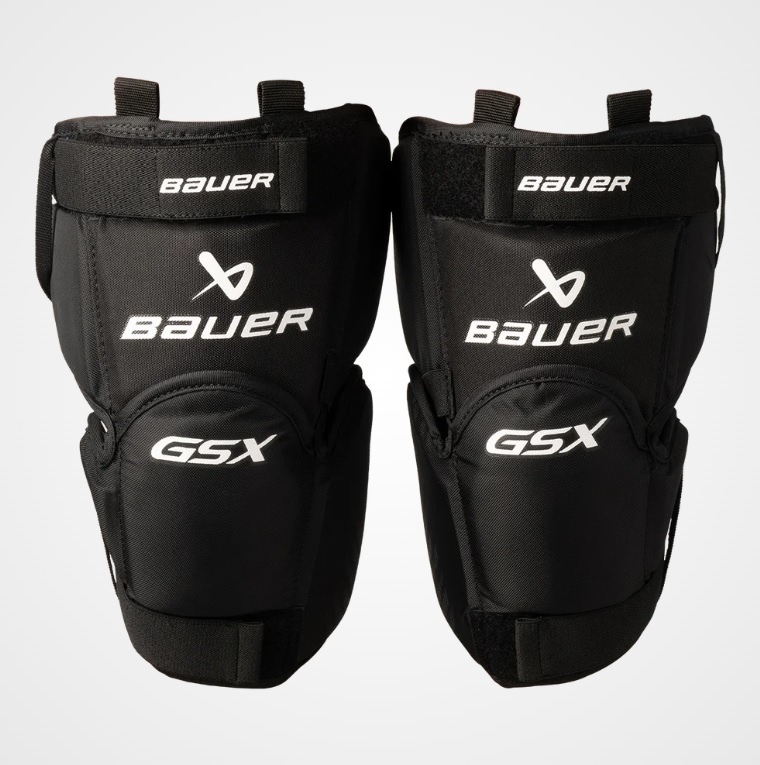 The GSX knee pads feature neoprene stretch straps. The straps are designed to attach to the velcro landing and keep the padding in place so goalies are protected while on the ice.