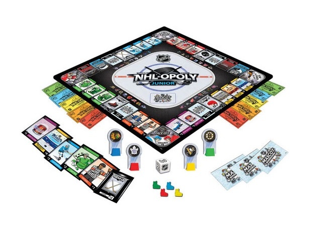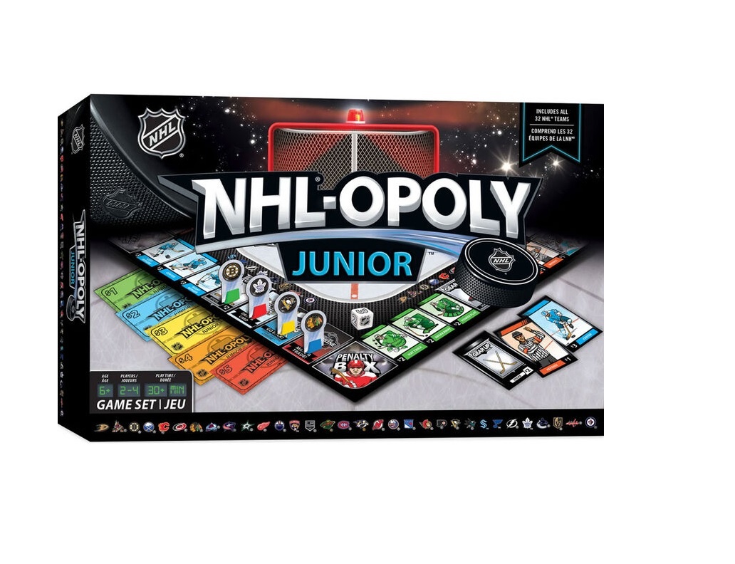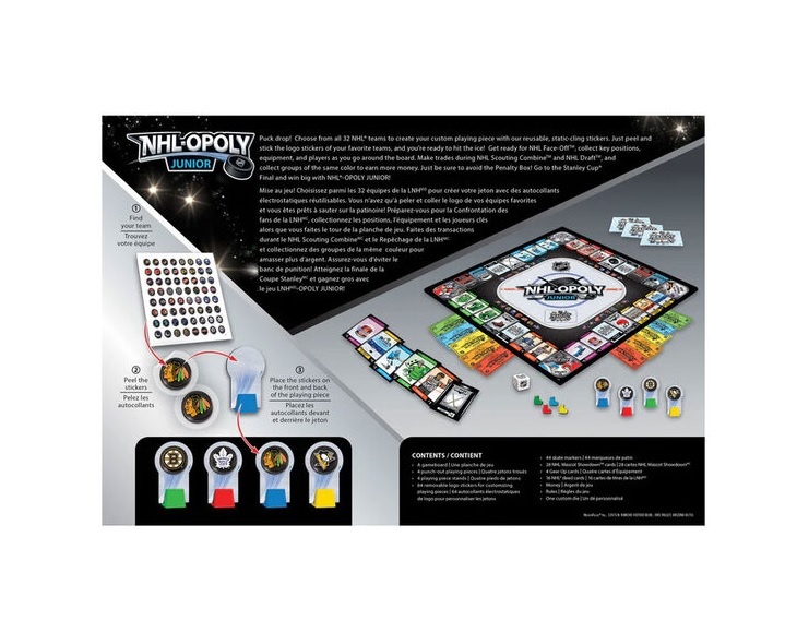 Puck drop! Choose from all 31 NHL teams to create your custom playing piece with our reusable, static-cling stickers. Just peel and stick the logo stickers of your favorite teams, and you're ready to hit the ice! Get ready for NHL Face-Off, collect key positions, equipment, and players as you go around the board. Make trades during NHL Scouting Combine and NHL Draft, and collect groups of the same color to earn more money. Just be sure to avoid the Penalty Box! Go to the Stanley Cup Final and win big with NHL-OPOLY JUNIOR!