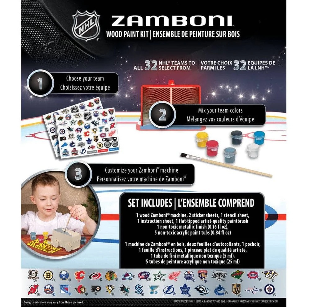 This NHL Zamboni Wood Craft & Paint Kit is made of real wood, and includes everything you need to create a beautiful work of art! The Zamboni Wood Craft & Paint Kit is the perfect gift for every art loving kid! It includes 1 wood Zamboni, 2 sticker sheets, 1 stencil sheet, 5 non-toxic acrylic paint tubs, 1 non-toxic metallic silver finishing paint, 1 flat-tipped artist-quality wooden paintbrush, and 1 instruction sheet with painting guide.