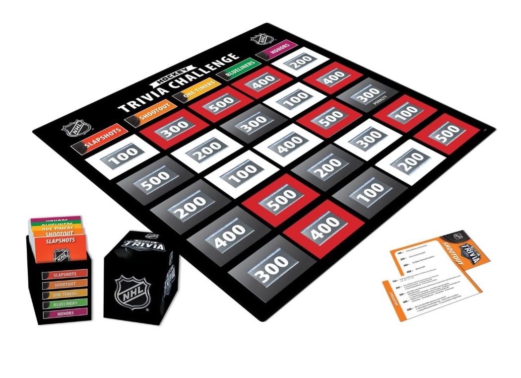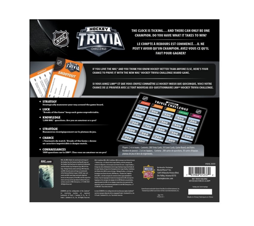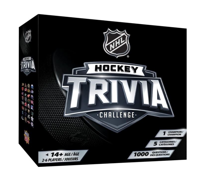 See if you have what it takes to be crowned NHL champion with the NHL hockey trivia challenge card game. Challenge your friends and family to this exciting game of trivia, with 1000 hockey-related questions in five categories to discover. Whoever answers the most questions correctly will be crowned the NHL champion of game night.