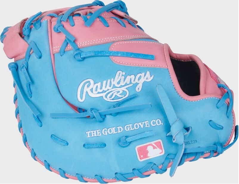 Make a bold statement at first base with the Rawlings Heart of the Hide 12.75-Inch First Base Mitt. This glove features a fresh Pink and Columbia Blue colorway that blends elite style with legendary performance.