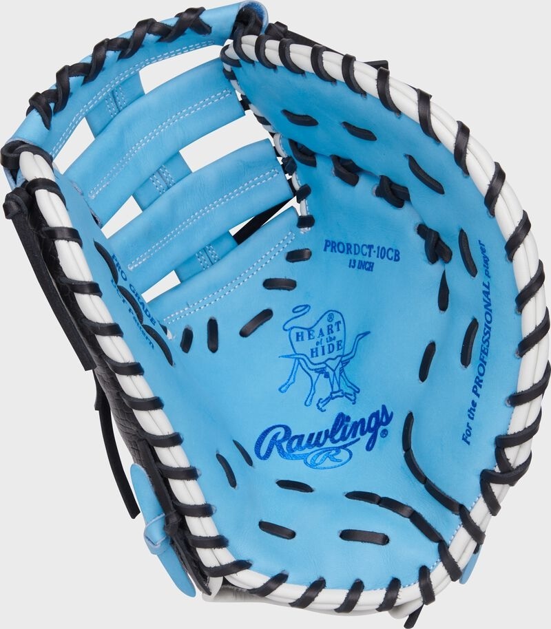 Scoop 'em all with the 13-inch Heart of the Hide first base mitt, a beautiful glove with a Columbia blue and black colorway. Additionally, the columbia blue on white Rawlings patch and columbia blue Oval-R are a nice touch to add some flare to the mitt.