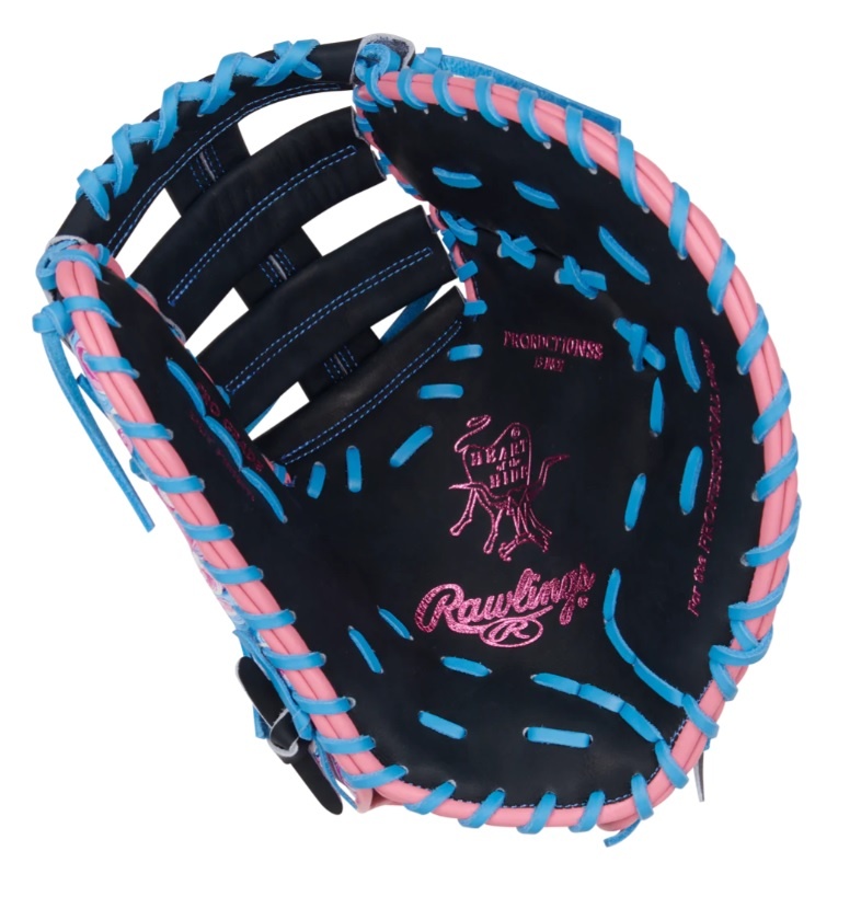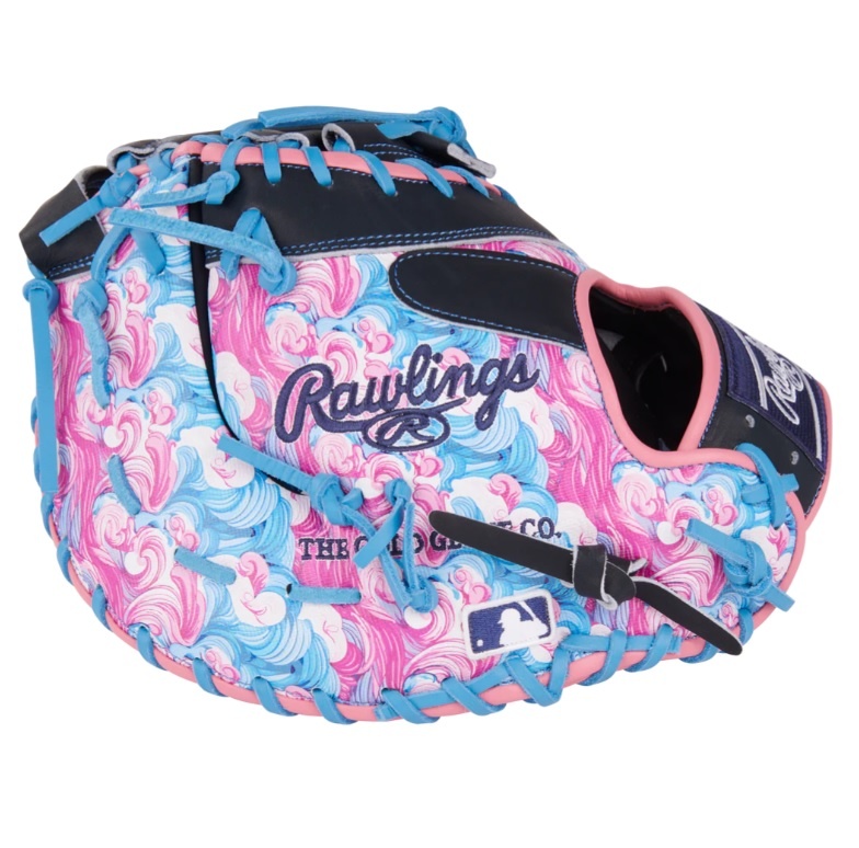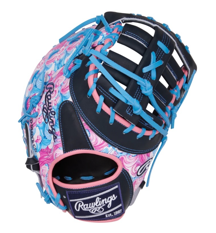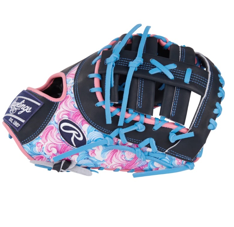 Make a statement with this 13-inch Rawlings Heart of the Hide ColorSync first baseman mitt! Featuring a bold wave-inspired design, this mitt blends vibrant pink, blue, and black tones for a look that’s as smooth as your game. The matching blue foil stamp and Rawlings patch add the perfect finishing touch to this eye-catching gamer.