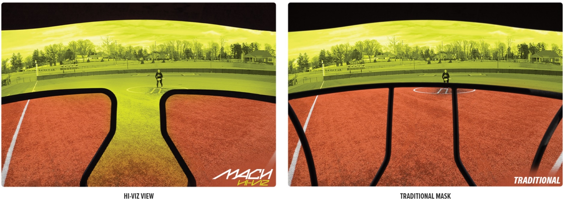 Coverage shouldn't come at a cost -- that's why we engineered the Rawlings Mach Hi-Viz fastpitch batting helmet, with the largest viewing window of any caged helmet on the market. Fastpitch athletes need a helmet and face mask that allows them to fully visualize each pitch. The Mach Hi-Viz helmet gives hitters and baserunners a 30% larger viewing window than traditional helmet/facemask combos, allowing for better pitch tracking and distraction-free baserunning.