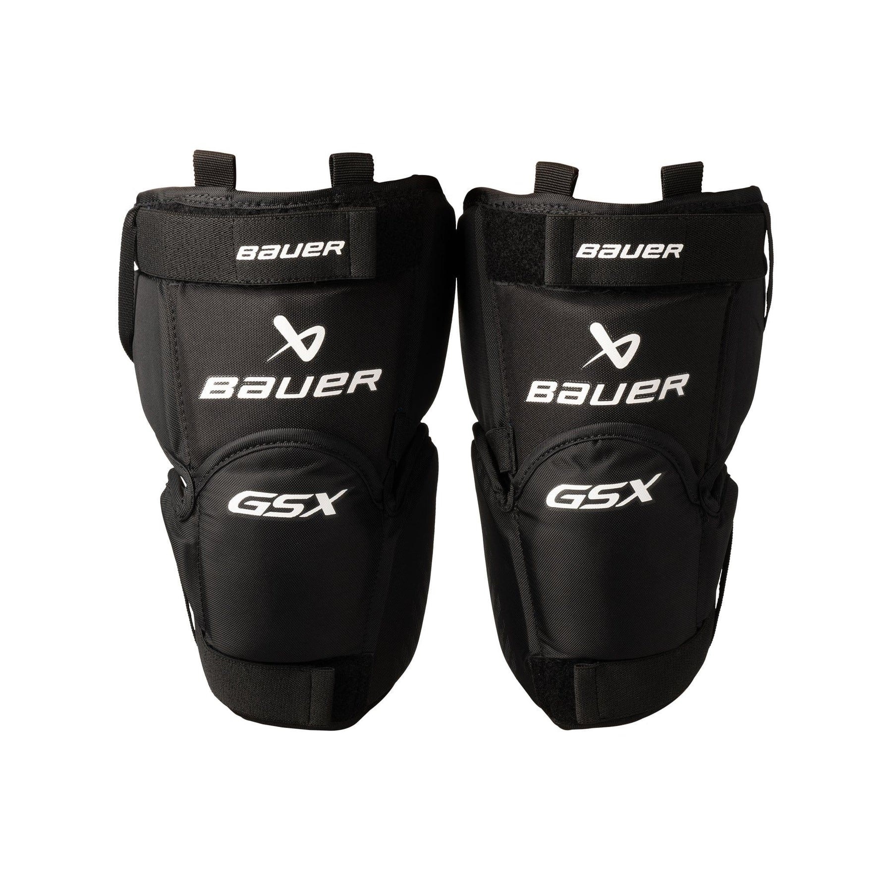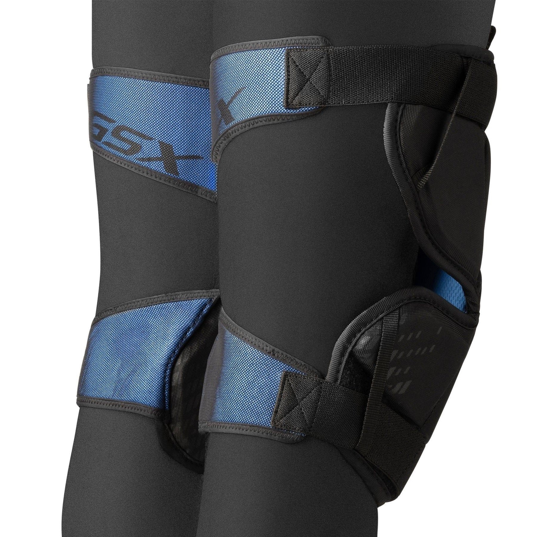 The GSX knee pads feature neoprene stretch straps. The straps are designed to attach to the velcro landing and keep the padding in place so goalies are protected while on the ice.