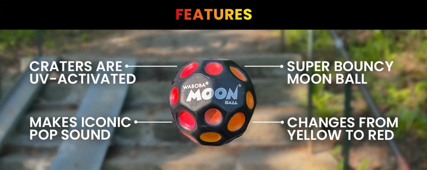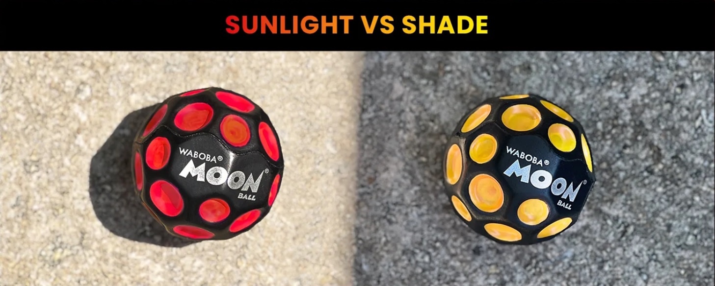 Introducing the sunny side of the Moon Ball! This special edition Moon Ball changes color in the sun. Give your Moon Ball a new solar power that's out of this world! Take it outside and watch how the craters change from yellow to red. Whenever you're back indoors or put the ball away, the crater color changes back to yellow. Just another reason to enjoy a day under the sun. Bounce it all day!