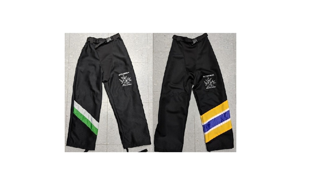 Made from a heavy-duty polyester material, the pants are strong, come belted and are double layered from the knee down.