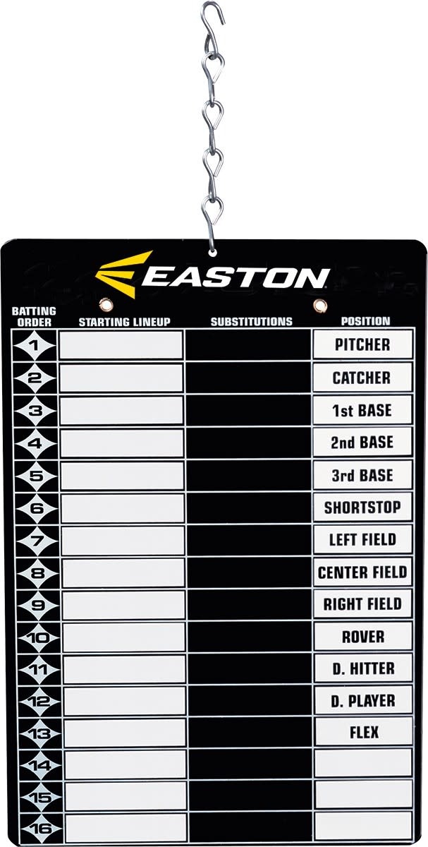 The Easton Magnetic Lineup Board features heavy duty construction and a metal fence hanging hook. These lineup boards have magnetic player / position pieces to make substitutions easy. The steel board is powder coated for extra durability and has a heavy duty metal paper holder on the reverse side.