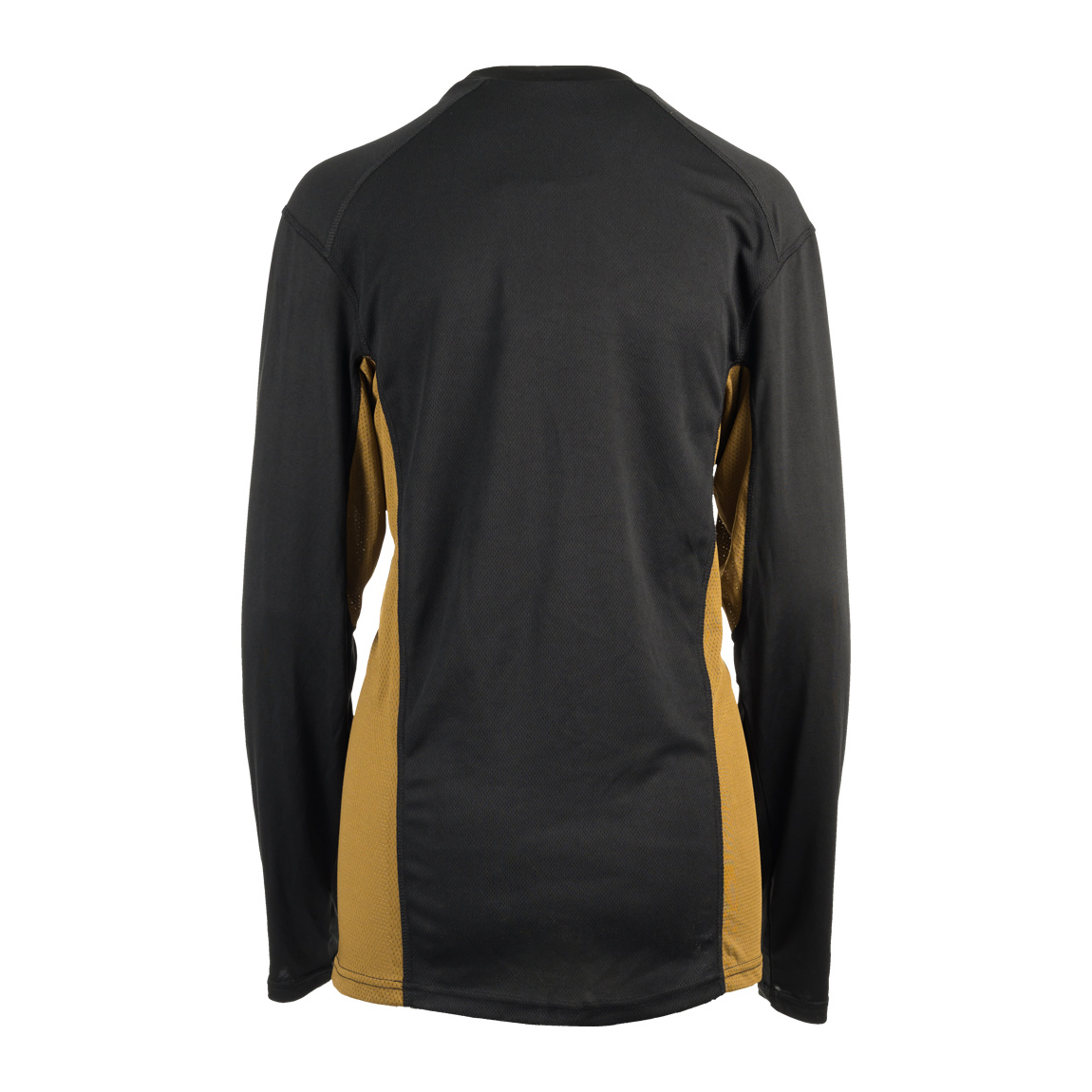 In a sleek Black and Olympic gold, this is a fitted shirt for a female silhouette. Body-fit long sleeve top, 4 ways stretch compression. Moisture wicking to keep you dry and comfortable!