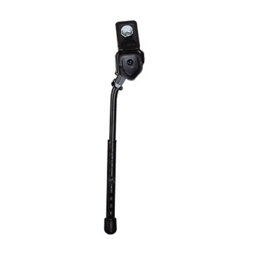 Made of strong hi-ten steel. Adjustable for wheel sizes 12" up to 20". Mounts in the center of the bike on the frame by the cranks. kicks back out of the way when riding. Black.