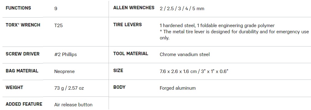 9 function pro quality tool folds in a sleek forged alloy body. An additional removable folding tire lever stores inside the tool body for a streamlined profile. Perfect for long road rides or endurance mountain biking. Includes a neoprene bag.