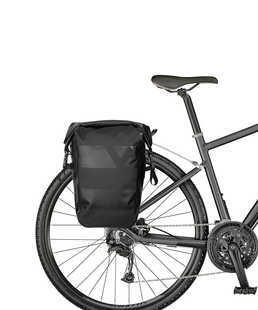 The new Pannier DryBag is constructed from a tough, sonically welded and seamed sealed waterproof material. A watertight roll-top closure provides maximum protection from trail dust, road spray and nasty wet weather. Our new Handle Loc system quickly and securely attaches the pannier to the rack and is quickly removed with a simple upward press & pull of the top mounted carry handle.