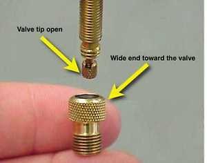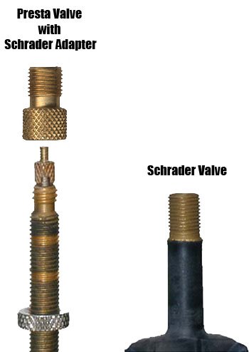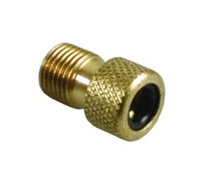 This little brass adapter changes your presta valve into a standard schrader valve, for air inflation with a pump that does not automatically adapt for different valve types.