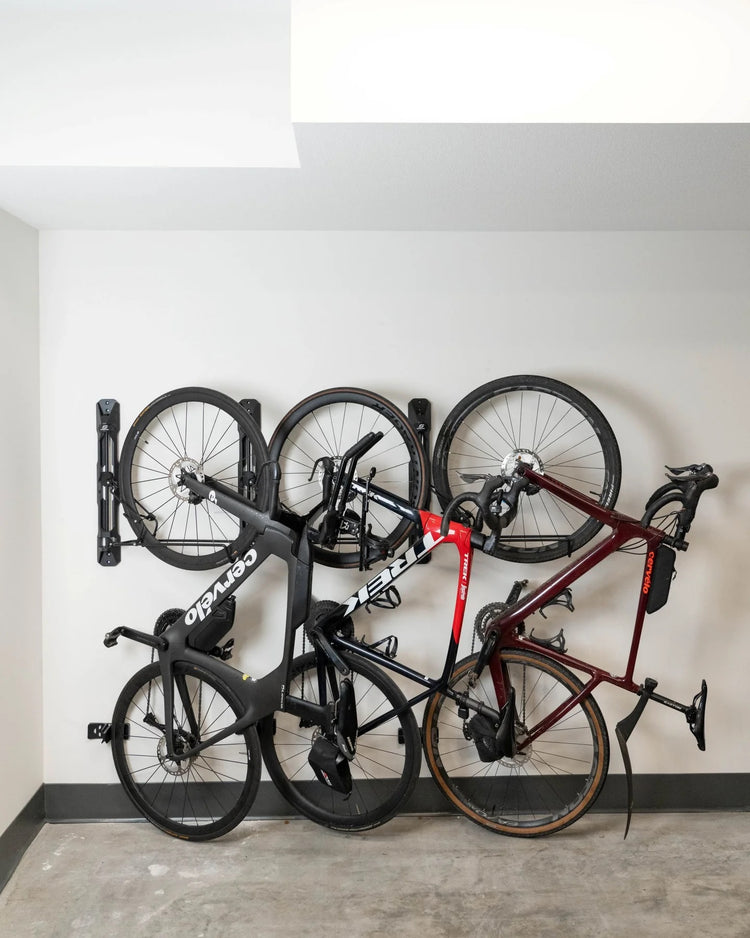 The Swagman Stow It is a space-saving wall-mounted bike rack designed for secure, zero-frame-contact storage. Holding your bike by the front wheel, it features a patented third point of contact that prevents rim damage—unlike other wheel-hanging racks that can scratch sidewalls. The rack pivots left or right, keeping bikes closer to the wall and allowing easy access when multiple bikes are mounted side-by-side. Strong, sleek, and thoughtfully engineered, the Stow It is the ideal solution for protecting your bikes while maximizing garage or storage space. Max weight 65 lb. per bike.