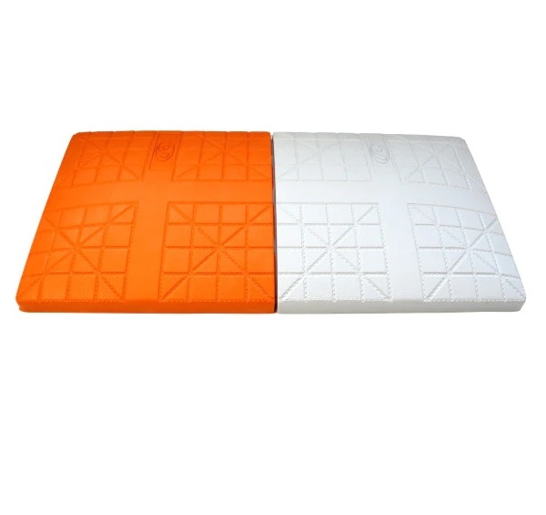 The RSRDB is a Rawlings Rubber Safe Release Double Base that is designed to compress on impact to reduce injuries.