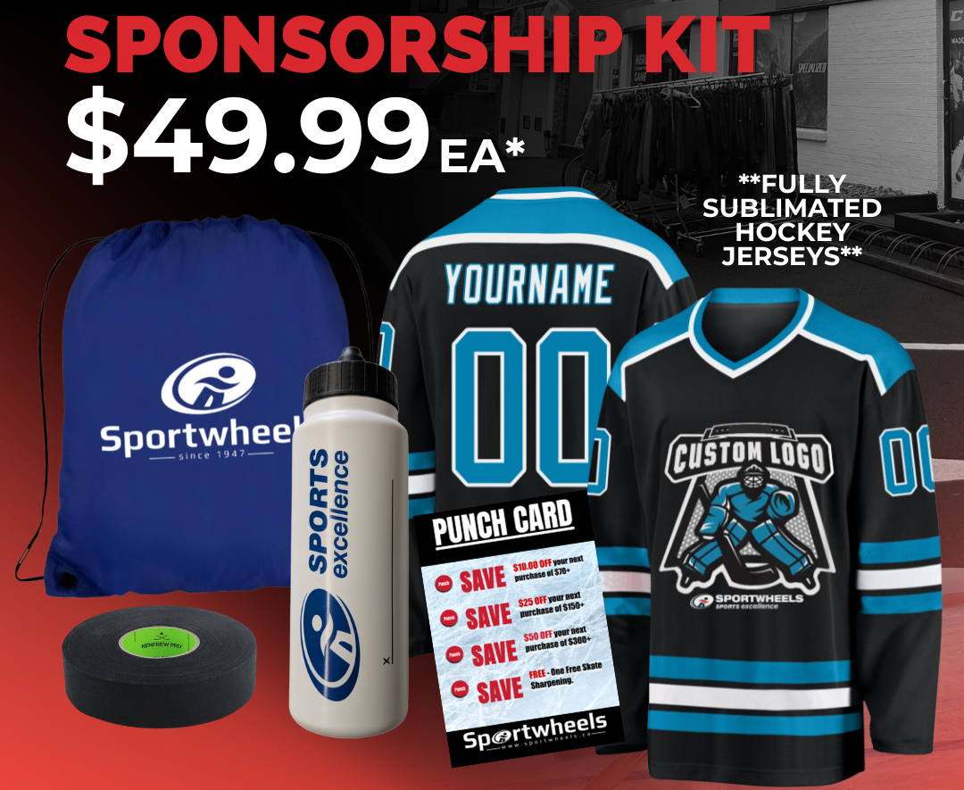 *This Sponsorship pricing and package are exclusive to fundamental recreational programs, including Come Try Events, Learn to Play Beginner Programs, and any recreation program designed to introduce new participants to the sport. All pricing is based on 15+ units per order, plus tax. Orders are 4-5 weeks from artwork approval and deposit. This Jersey kit includes large Sportwheels Logo above or below player numbers on back.