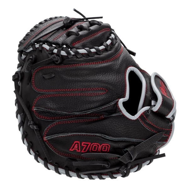 Step up behind the plate with the Wilson A700 32.5" Baseball Catcher’s Mitt! Engineered for adolescent and teenage catchers, this mitt offers a nearly game-ready feel, designed to keep you focused on catching strikes and blocking wild pitches. Its sleek black and white colorway, with red lining, adds a touch of style while delivering top-tier performance.