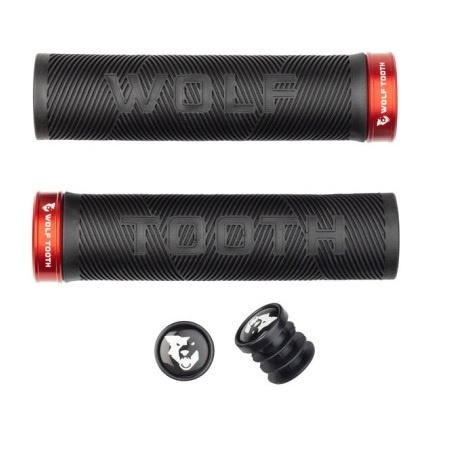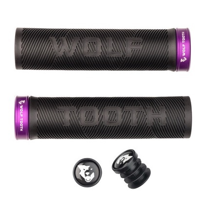Wolf Tooth Echo Lock-On Grips are made for mountain biking in any/all forms. The rubber material is soft and tacky to the touch, while the alternating diagonal pattern of the grip keeps the rider’s hand in place with or without gloves in all conditions. Grips are made with black molded rubber and come with anodized aluminum collars that match the eight primary colors of other Wolf Tooth anodized accent pieces. Includes Wolf Tooth plastic bar end plugs. Upgrade to matching Alloy Bar plugs or store tools in your handlebars with the Wolf Tooth EnCase System.